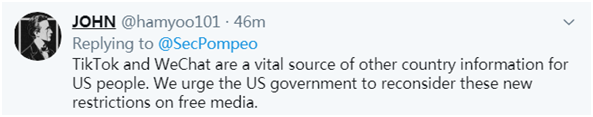 一些网友则模仿蓬佩奥的语气,来表达对美国围猎Tiktok的不满。一位网友写道,“TikTok和微信是美国人民获取其他国家信息的重要来源。我们敦促美国政府重新考虑对这些自由媒体的最新限制。”