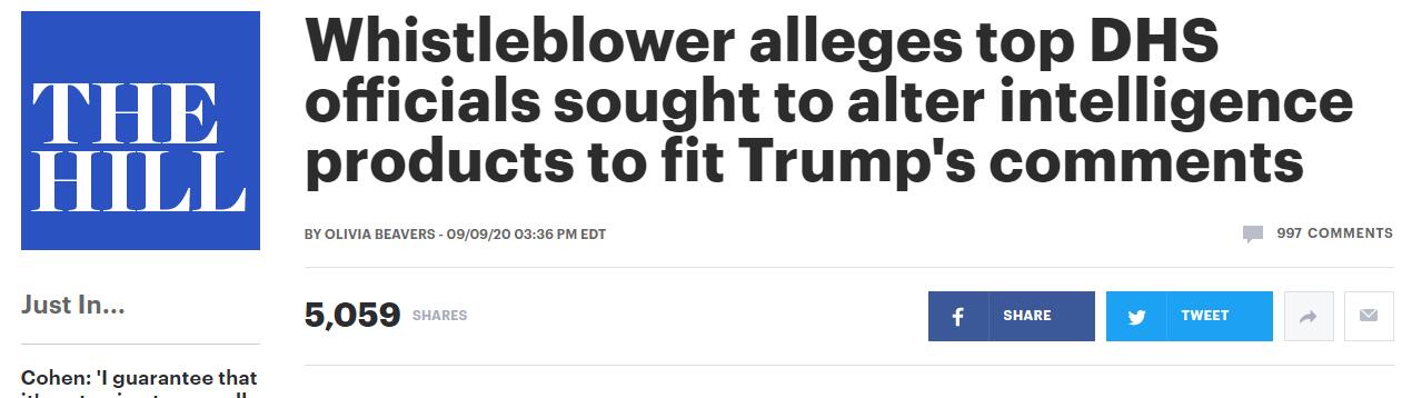 [环球网报道记者侯佳欣]当地时间9月9日,美国众议院情报委员会公布一份举报人投诉书。该投诉指控国土安全部高层将情报工作“政治化”,迫使其配合特朗普言论修改情报评估,关注中国和伊朗,而非俄罗斯。据美国有线电视新闻网(CNN)、《国会山报》等美媒报道,这名举报人名叫布赖恩·墨菲,曾担任国土安全部负责情报与分析办公室的代理副部长。在众议院情报委员会接到的投诉书上,前国土安全部长科斯特珍·尼尔森、现国土安全部代理部长查德·沃尔夫、代理副部长肯·库奇内利等高层赫然在列。