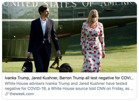 伊万卡等人检测结果呈阴性。/the week报道截图除这几位关键政治人物外,特朗普子女的状况也引发关注。据美媒消息,特朗普的几个子女检测结果都呈阴性,包括两个成年儿子小唐纳德、埃里克,女儿伊万卡、女婿库什纳,以及14岁的小儿子巴伦。文/谢莲 点击进入专题:特朗普夫妇确诊新冠肺炎 责任编辑:郑亚鹏 SN238 免责声明:本网站所有信息仅供参考,不做交易和服务的根据,如自行使用本网资料发生偏差,本站概不负责,亦不负任何法律责任。涉及到版权或其他问题,请及时联系我们。