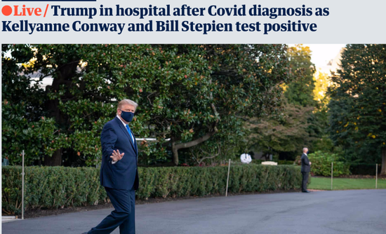 特朗普前往沃尔特·里德医疗中心。/《卫报》截图距离美国11月3日的大选仅有一个月的时间,特朗普确诊入院,不仅给美国即将到来的大选带去变数,同时也让外界对美国政府的持续运行打上了问号。尤其是,在特朗普宣布确诊后,几乎每隔几个小时就有身边人宣布确诊,其中包括他竞选团队的关键人物,也包括国会中的高级议员。不过,备受关注的民主党总统候选人拜登、现任副总统彭斯、众议院议长南希·佩洛西等人并未被感染。分析认为,特朗普感染或将让他竞选连任面临更大挑战。特朗普出现症状后入院,开始服用瑞德西韦治疗据美国有线电视新闻网(CNN)报道,白宫新闻秘书麦肯尼10月2日晚在推特上发布了特朗普医生肖恩·康利提供的最新治疗消息。康利称,“今天下午,在和沃尔特·里德以及约翰斯·霍普金斯大学的专家咨询过后,我建议总统转移到沃尔特·里德国家军事医疗中心接受进一步的观察。今天晚上,我很高兴地报告,总统状态很好”,“他并不需要补充氧气,但在咨询专家后,我们决定启动维德西韦药物治疗。他已经服用完第一剂,目前正在休息”。