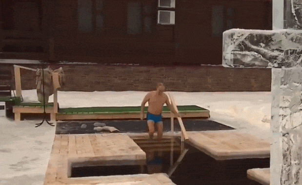视频显示,普京披着一件大衣走出木屋,随后脱下衣服,只穿一条蓝色短裤迈进一个十字形的冰水池。