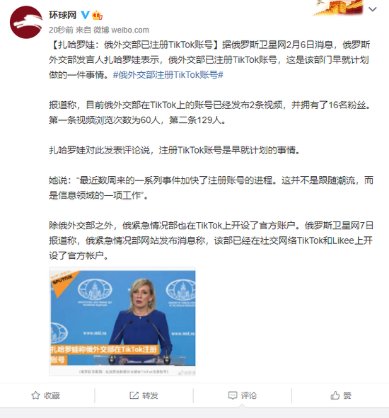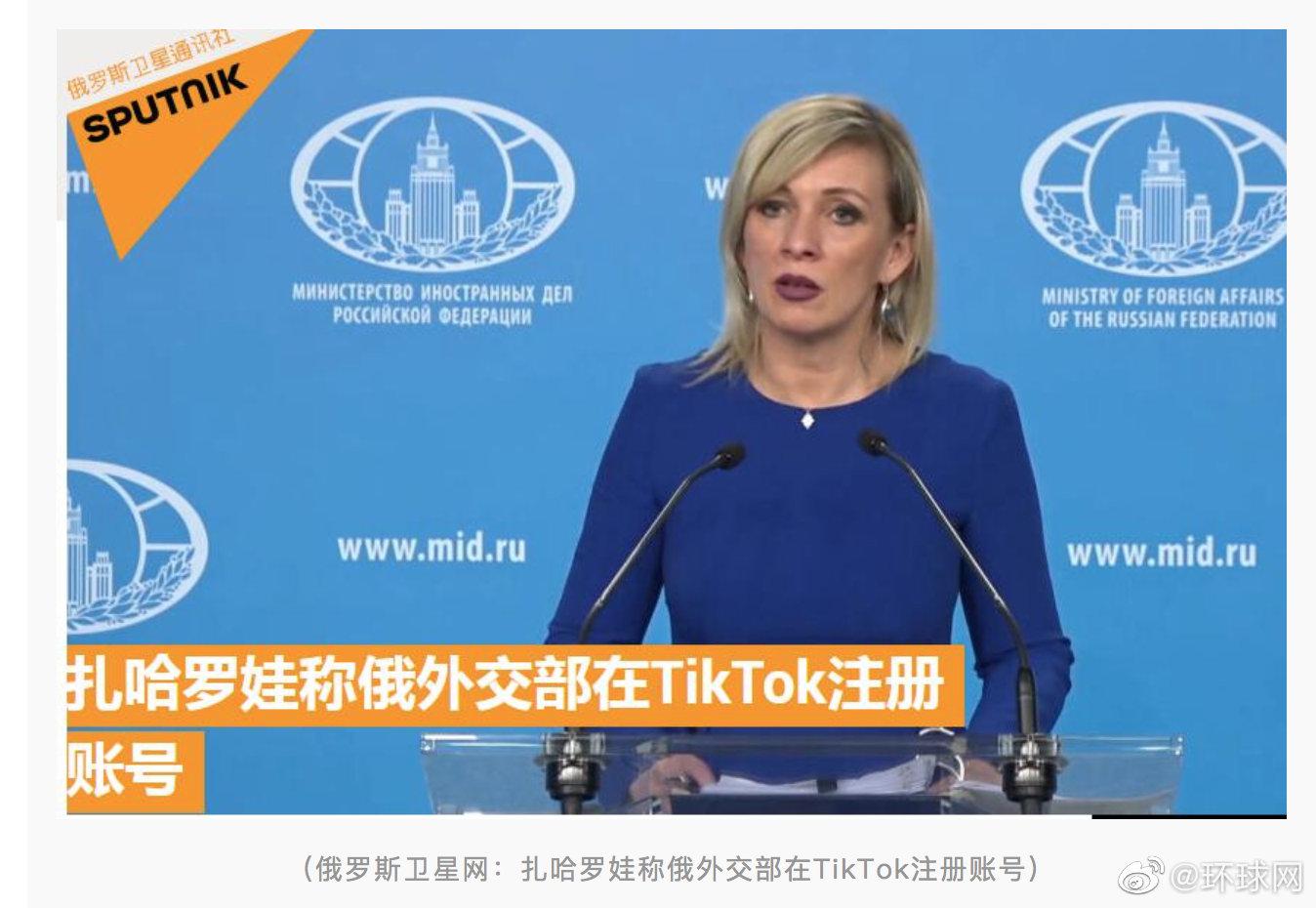 原标题:扎哈罗娃:俄外交部已注册TikTok账号