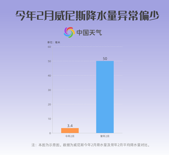 第二,今年以来,欧洲降水量呈现东多西少的格局,位于欧洲中南部的意大利降水偏少。对于威尼斯来说,2月本就是全年降水量最少的月份,今年的情况则是少之又少,今年2月份当地降水量仅有3.4毫米,和常年2月的50毫米相比异常偏少,这也导致河流补给不足。
