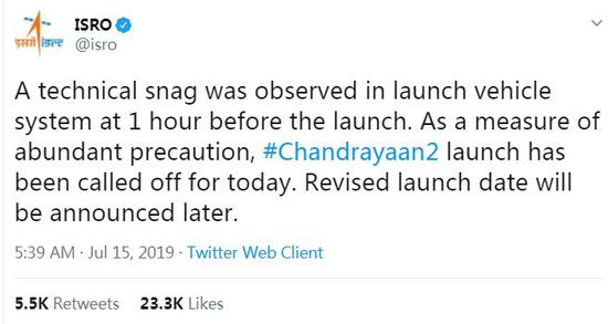 15日,印度太空研究组织发推: