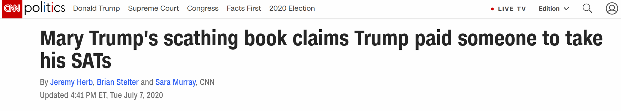 在新书《太多和永远不够:我的家族如何造就了世界上最危险的人》中,玛丽写道,特朗普招募了“一个聪明的孩子,一个有名气的优秀应试者来替他考SAT”。她还补充说,这名替特朗普考试的人为此付出了很多努力。