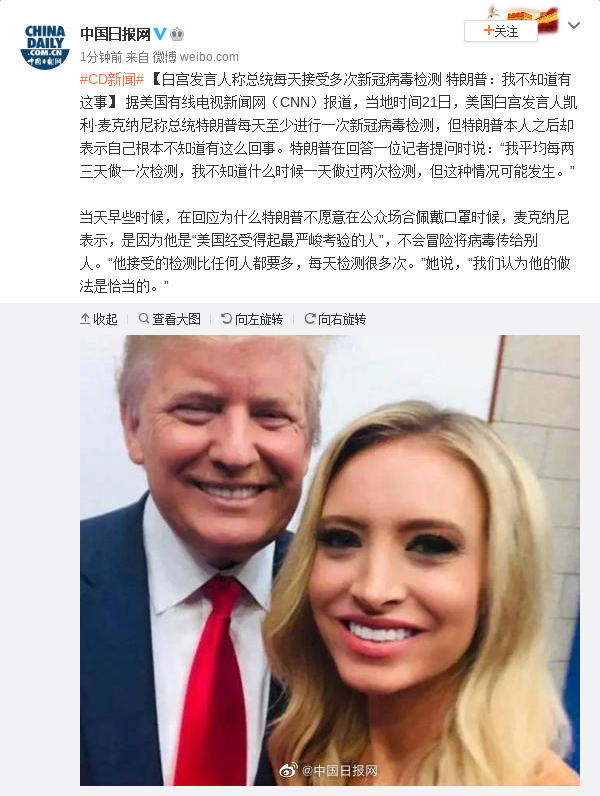 据美国有线电视新闻网(CNN)报道,当地时间21日,美国白宫发言人凯利·麦克纳尼称总统特朗普每天至少进行一次新冠病毒检测,但特朗普本人之后却表示自己根本不知道有这么回事。特朗普在回答一位记者提问时说:“我平均每两三天做一次检测,我不知道什么时候一天做过两次检测,但这种情况可能发生。”