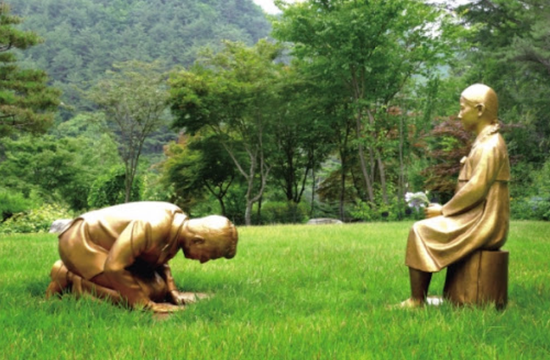 据《日本时报》27日消息,近日,韩国平昌一家私营植物园在园区内新建了一座名为“永恒赎罪”的雕像。雕像由两部分组成,一位男子跪伏在地,向另一名端坐在一旁的“慰安妇”道歉。“慰安妇”是对二战中被日本强征为妓的女性的婉称。