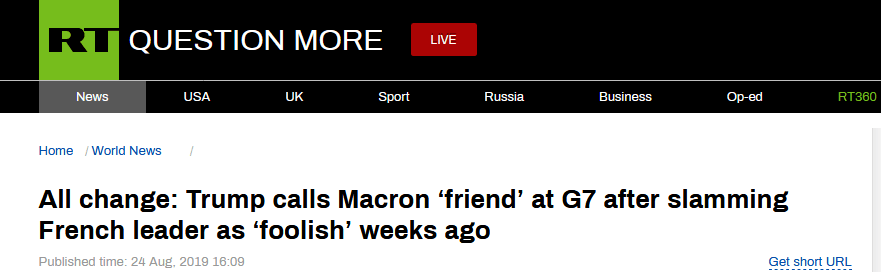 对于之前二人间的不愉快,RT称,特朗普24日用一种类似“男人就是这样”的方式解释说,“我俩每隔一段时间就会有这么一点(争执)”。不过,特朗普对马克龙的“友好”这次究竟能持续多久,RT依然表示质疑。