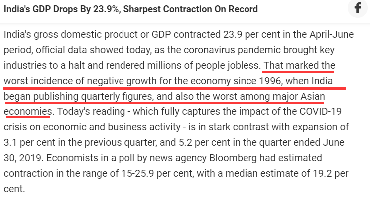 印度财政部首席经济顾问克里希纳姆特西(Krishnamurthy Subramanian)就表示这个数据符合印度在4月到6月这个季度一直处在疫情封锁之下的现实情况,绝大多数经济活动都被限制了,所以该GDP数据符合预期。