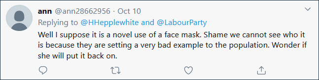 还有人无奈地讽刺道,“好吧,我猜这是口罩一种新颖的用法。。。。。。这为民众树立了一个非常坏的榜样。”