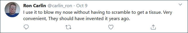“我还可以用口罩来擦鼻子,都不用纸巾了,非常方便。他们应该在数年前就发明这种用法。”