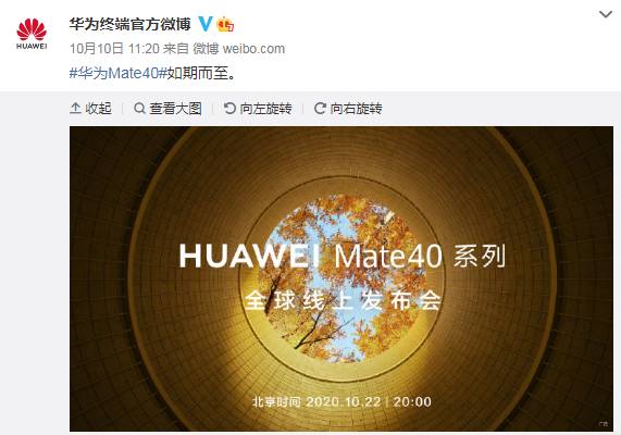 10月10日,华为官方宣布,将于北京时间10月22日20:00举办全球线上发布会,届时华为将发布旗舰产品Mate40系列。“史上最强大的华为Mate敬请期待!”华为消费者业务CEO余承东通过个人微博介绍称。