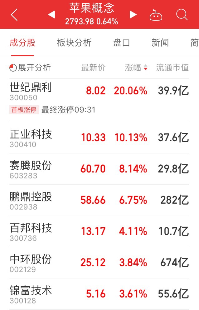 同花顺数据显示,10月13日,A股苹果概念板块微涨0.64%,板块中上涨股票48只,下跌44只。世纪鼎利、当升科技、爱施德、领益智造、立讯精密、环旭电子等苹果概念股近10个交易日累计涨幅均超过10%。