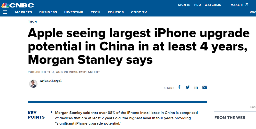 摩根士丹利之前给出的一份报告还显示,iPhone 12发布前夕,中国市场上的“iPhone更新换代可能性显著”,具体来说就是,中国市场上有68%以上的iPhone至少已经使用了两年时间。根据摩根士丹利的数据,这个数字比去年上升了8%,与2017年的相比更是增加了20%。