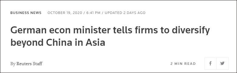 路透社报道截图今年9月,德国政府发布一份政策指导文件,正式推出“印太政策”(Indo-Pacific Policy)。基于这一政策,德国政府呼吁经济界各企业避免过于依赖中国,鼓励他们扩大亚太市场。