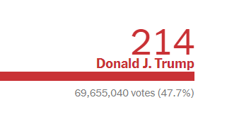 如下图所示,截至11月6日下午2时,特朗普也已经在此次大选中获得了总共6965万余票,同样打破了奥巴马保持的那个得票记录。