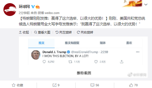刚刚,美国共和党总统候选人特朗普用全大写字母发推表示:“我赢得了这次选举,以很大的优势!”
