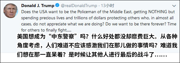 12月19日,美国总统特朗普突然宣布从叙利亚撤军,舆论一片哗然,不仅受到美国国内媒体批评,连盟友也不认同。特朗普连发数条推特为撤军行为辩护,直言美国“不想当中东警察”。然而,国防部长马蒂斯紧接着就辞职了。