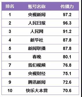 作为一级指标,在传播力榜单前十位中,“央视新闻”、“人民日报”和“人民网”排名前3甲;“快乐大本营”是地方广电媒体账号传播力的第1位;“春晚”在传播力榜单中居第6位,该账号截至2019年12月拥有1128万粉丝,视频完播率达到84.1%,在广电栏目账号中仅次于“新闻联播”。