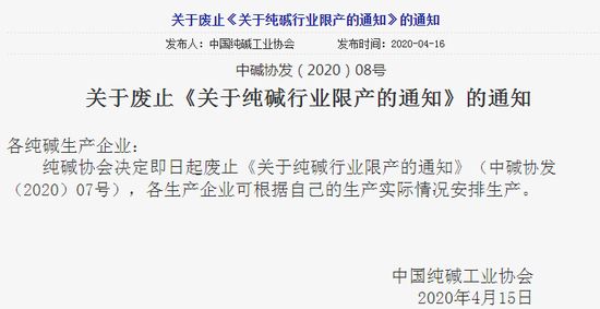 4月16日,纯碱工业协会发布公告,2020年1月以来,突如其来的疫情对行业生产造成了严重的影响,疫情初期,由于原材料及产品运输困难,造成原料运输困难,产品积压,行业开工率下降。3月份以来,随着疫情的缓解,运输条件的改善,行业开工率又逐步回升,目前行业开工率已达到85%以上。