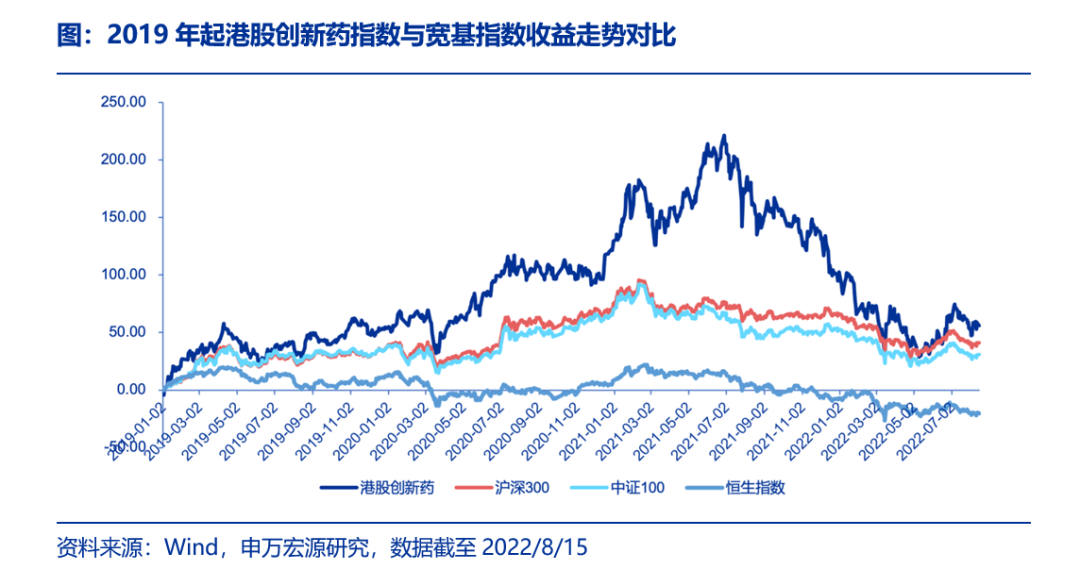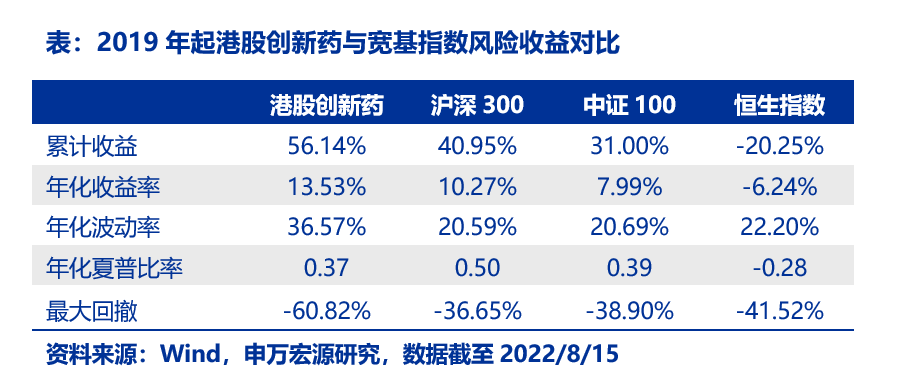 2019/1/2至2022/8/15的投资区间内,港股创新药指数期间累计收益率达到56.14%,年化收益率达到13.53%,年化收益率高于其他A股市场主要宽基指数以及恒生指数,说明其收益能力在过去三年相比较而言更为出色。