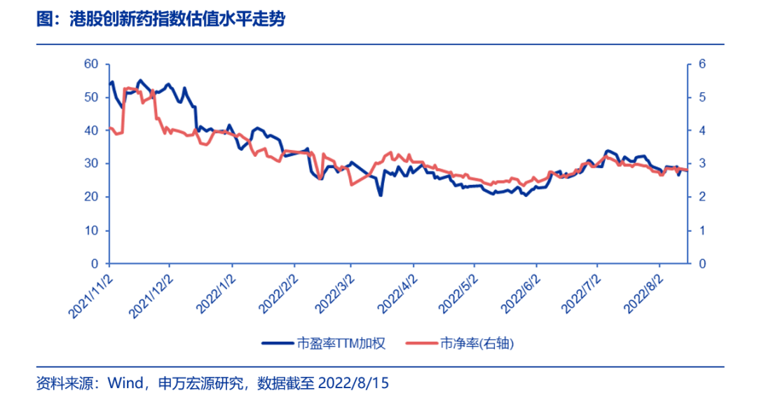 截止至2022年8月15日,港股创新药指数的市盈率为28.05倍,市净率为2.82倍,分别位于2021年11月2日以来的39.56百分位和31.32百分位。当前指数估值已处于历史中等偏下水平。