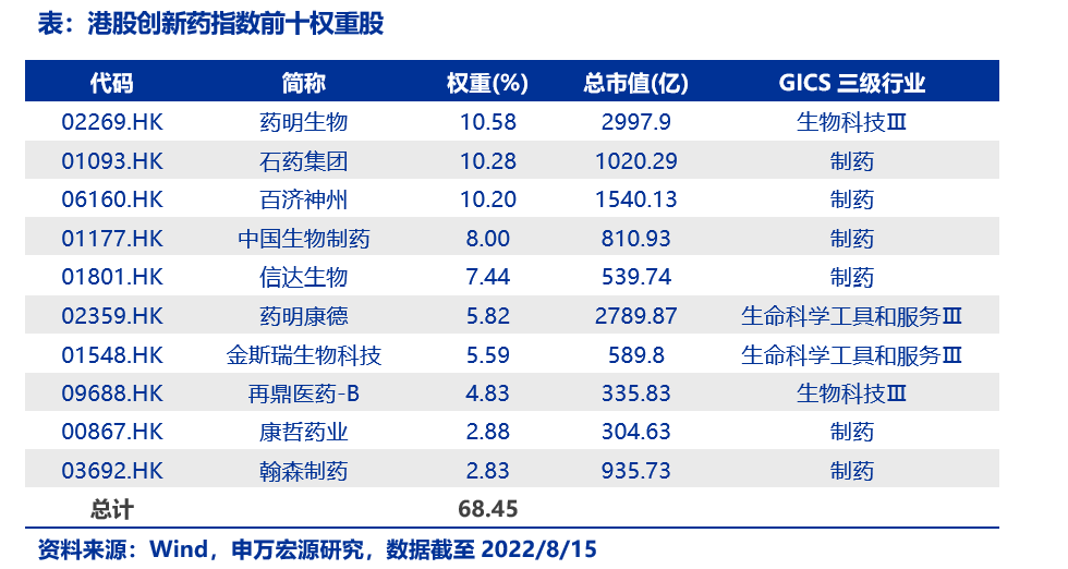 港股创新药指数前十大成分股权重合计为68.45%,权重排名前三的股票分别为药明生物、石药集团和百济神州,权重分别为10.58%、10.28%、10.20%。前十大权重股共涉及3个GICS三级行业,其中制药行业独占6只前十大权重股,生物科技和生命科学工具和服务各有2只。