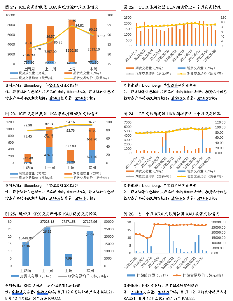 本周(8月22日-8月28日)国外碳配额二级市场价格涨跌不一,但成交量均有所上涨。欧盟本周一级市场拍卖量442.15万吨,同比下降22.98%,拍卖周均价92.32欧元/吨,相比上周的周均价下浮0.66%,根据EEX官网拍卖日历,由于2022年9月单次拍卖量将回归正常,相比8月单次拍卖量有所回升,故碳价下跌。欧盟二级市场EUA总成交量小幅上涨2.03%,本周平均碳价有所回调,在90欧元/吨左右徘徊,期现货价格分别同比下降4.72%、5.58%,周内期现货碳价呈U型走势。本周英国二级市场本周UKA期现货成交量分别上涨101.92%、625.39%,现货成交均价下跌1.01%,期货成交均价上涨0.08%。韩国市场本周KAU22现货成交量大幅增加,合计成交量24.05万吨,同比上升200.88%,平均碳价略有下跌,跌幅为0.53%。
