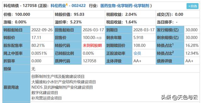目前转股价值95.03,溢价率5.23%,发行规模30亿,题材是医药生物。