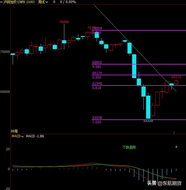 3)技术分析:以周线图进行中长趋势分析:MACD指标分析,红色快线处于绿色慢线下方,成蓝色看跌柱子,处于空头形态;波浪分析、黄金分割分析与K线形态分析,前提从高位75300附近下跌至53320形成主跌一浪,趋势酣畅淋漓,势如破竹,而调整二浪,目前到位0.382与0.5分位之间,并局部呈现K线走弱形态;综合以上,趋势重返跌势的概率偏大;