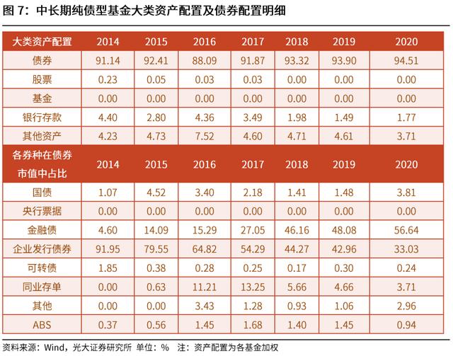 债券型基金主要以中长期纯债型基金为主,截至2020年底,占比74.30%,纯债型基金仅配置固收类的产品,最为契合债券基金分享债券收益的内涵。在经济增速下行周期,投资者风险偏好降低,银行、保险机构的大量资金拥有较大投资需求,以上因素推动了资产配置风险较低的中长期纯债基金自2015年以来的的不断扩容,该类基金正稳定持续发展为一个大规模的基金细分市场。