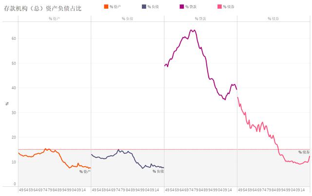 随着贷款和储蓄规模的快速增长,存储机构的资产和负债规模均曾在二战结束后的十多年里增长至美国金融资产和负债的15%以上。从上个世纪80年代开始,随着贷款和储蓄增长速度的下降,存款机构在美国金融资产和负债中的比例均已下降至10%以下。作为传统的金融机构,在美国80年代开始的金融体系变革中,存款机构的市场影响力也随着资产和负债占比的下降而出现了大幅度下降。