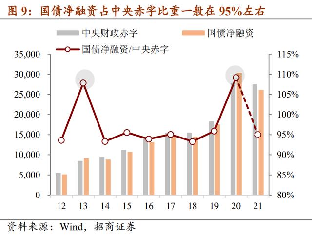 其二,今年国债发行总量可能维持在7万亿。国债净融资规模一般控制在中央赤字范围内,中央赤字超预期意味着国债净融资超预期。当然,国债净融资理论上可以突破中央赤字,例如2020年国债净融资就达到中央赤字的109%左右(可能是动用上年末中央债务实际余额低于限额的结余部分),但在历史上属于“个例”。按照一般情况,国债净融资占中央赤字的95%左右,今年2.75万亿的中央赤字对应2.6万亿左右的国债净融资。