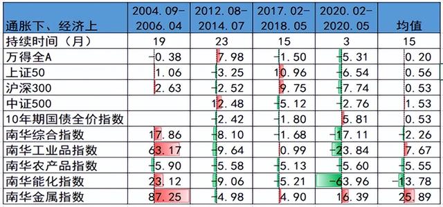 另外,由于南华商品指数以及各板块指数从2004年6月开始面世,因此我们对于上述投资标的收益率的统计也从2004年6月开始算起,但对于不完整周期下的资产表现我们在最终统计规律时会对其进行剔除。对于不同经济周期下各种资产收益率表现我们在剔除不完整周期后对剩余期限进行算术平均。