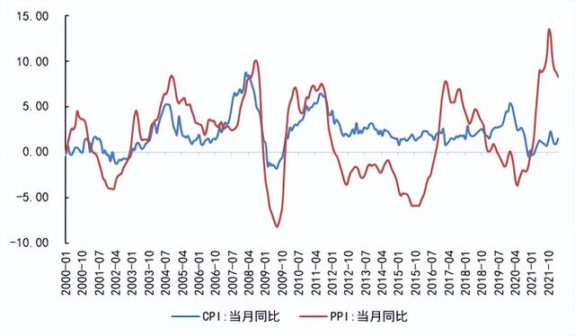 我们的第一个判断是当前时期处于通胀下行期。GDP平减指数于去年9月见顶,PPI则于去年10月见顶。今年以来,尽管市场纷纷扰扰,但在保供稳价政策下,PPI持续下行,这种趋势我们预计也将持续下去。尽管CPI可能在下半年有所回升,但我们预计回升幅度相较于PPI的下降幅度小。从历史上看,PPI对GDP平减指数的影响力也更大,特别是在PPI变化幅度更大的时候。