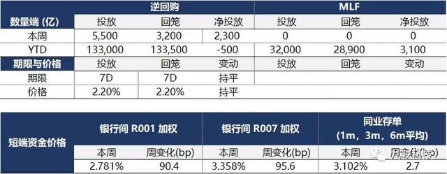 本周(11月8日-11月14日)央行本周投放5500亿元,同时有3200亿元逆回购到期,累计净投放2300亿元。截至周五收盘,银行间质押式回购隔夜为2.79%,较上周五大幅度上升90BP;银行间质押回购7天为3.36%,较上周上升96BP;同业存单平均发行利率3.10%,较上周上行2.7BP。