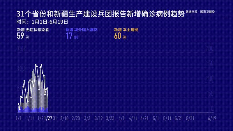 6月19日0—24时,31个省(自治区、直辖市)和新疆生产建设兵团报告新增确诊病例23例,均为境外输入病例(广东12例,云南4例,上海3例,浙江2例,福建1例,四川1例);无新增死亡病例;无新增疑似病例。