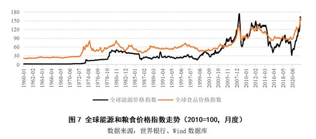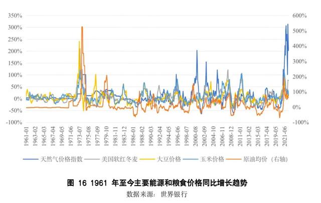6月8日,联合国秘书长全球危机应对小组(GCRG)发布第二份关于粮食、能源和金融系统的最新报告。报告指出,粮食、能源和金融渠道之间也开始相互作用,形成恶性循环。譬如更高的能源价格(特别是柴油和天然气),加剧了化肥和运输成本,两者推升粮食生产的成本,导致农业产量下降,甚至进一步强化了食品价格的上涨,这些又加剧了整体的通货膨胀趋势。总地来说,这一轮原油、天然气和粮食价格的上涨,与触发1970年代滞胀的石油危机和粮食危机相比毫不逊色(图16)。