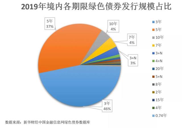 从发行期限看,2019年中国境内绿色债券(不包括绿色资产支持证券,如无特殊说明下同)发行期限仍主要集中在3年期和5年期,两者合计的中短期绿色债券发行数量及规模占比分别为74%和83%。同时,7年期和10年期绿色债券发行数量和规模较过去几年有所增加。
