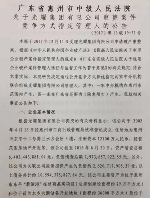 2018年1月4日,惠州市中级人民法院对外发布一则公告称,已于2017年12月11日正式受理光耀集团申请破产重组案。截至2016年6月30日,光耀集团清查资产总额为64.03亿元,负债清查总额达79.7亿元,为关联公司提供担保产生的负债约26亿元,债务总额合计近106亿元,资不抵债,破产重整。