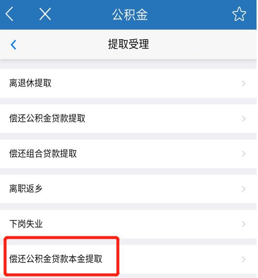 偿还公积金贷款本金提取(即还本金,公积金直接冲减贷款本金余额)。点击提取受理,选择偿还公积金贷款本金提取。