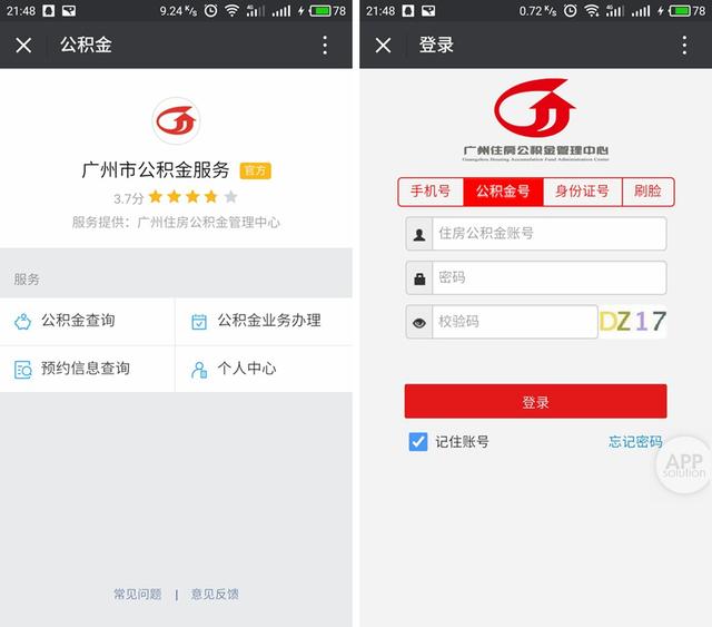 在「城市服务」点击「公积金」后,我们就会看到下面左图的界面。首次使用,同样需要进行登录,不过登录方式就更多花样了。除了能用手机号、身份证号和公积金号进行登录,甚至还能「刷脸」。