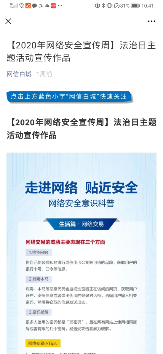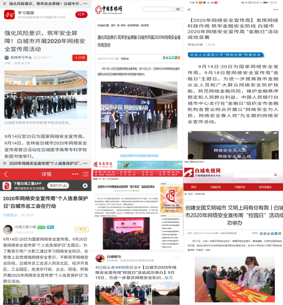 白城市委网信办组织域内白城新闻网、白城电视网、白城之窗三家网站,“指尖白城”、“爱看白城”、“网信白城”微信公众号开设了“2020年网络安全宣传周”专栏,每日推送网络安全宣传周活动宣传稿件和宣传作品,做到了“网络安全宣传周 线上宣传天天有”。学习强国、中国吉林网转发白城市2020年网络安全宣传周活动稿件。目前刊发活动稿件、作品共225篇,阅读量达160000 。同时组织全市各地、各部门(单位)利用系统局域网、单位门户网站、官方微博微信、网络大V等宣传推送网络安全知识和宣传标语。