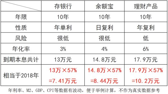例如:2018年手上有10万现金准备投资理财10年,如下表: