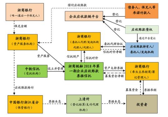 交易的发起机构代理人浙商银行按照国内现行的有关法律及规章,将其代理的委托人合法所有且符合本交易信托合同约定的合格标准的应收账款债权作为基础资产,采用特殊目的信托载体机制,通过中铁信托有限责任公司设立“浙商链融2018年第一期企业应收账款票据信托”。中铁信托以受托的基础资产为支持在全国银行间债券市场发行资产支持票据。投资者通过购买并持有该票据取得该信托项下相应的信托受益权。