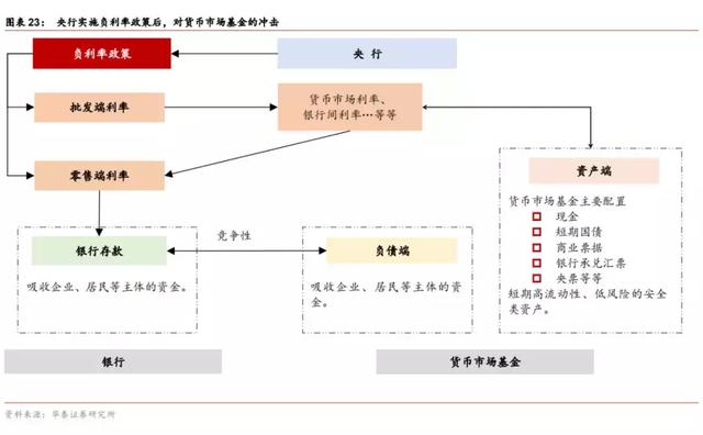负利率政策实施后会冲击货币市场基金资产端。根据货币市场基金的投资范围来看,由于负利率政策对广谱利率的影响,货币市场基金资产端将承受一定冲击。货币市场基金的投资范围主要为现金、短期国债、商业票据、银行承兑汇票等,负利率政策实施后,银行向货币市场提供的流动性增多,货币市场利率显著下行,同时短期国债在流动性的支撑下收益率下行,从货币市场基金资产端角度来看,可配资产的收益率均在不同程度上出现下行,如果想寻求高收益资产势必需要提升风险偏好,拉长久期会受到潜在的流动性兑付限制,寻求相对高风险资产会导致不确定性加剧,同时负利率政策的实施会导致一定的流动性分层情况出现,高流动性资产的收益率也会下降。因此,负利率政策的实施会冲击货币市场基金收益率水平,导致高流动性、高安全性与稳健收益出现制衡,影响货币市场基金对投资者的吸引力。特别是,如果货币市场基金收益率进入负区间,不如直接持有现金。