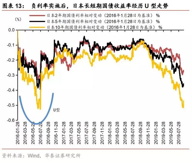 负利率与收益率曲线倒挂无直接关系,负利率政策的成效对收益率曲线是否倒挂有影响。根据欧元区各国负利率政策实施后的表现来看,利率曲线短期走势呈现为陡峭化,中长期10y-2y长短端利差收窄。我们认为,利率曲线实质上反映是市场及基本面现状,传统货币政策对短期利率影响较大,长期利率取决于市场预期以及经济增长、通胀和通胀预期等基本面表现,收益率曲线倒挂反映的是长期基本面及预期悲观,带动长端利率下行,而短期利率受货币政策牵制。利率曲线基本形态有三种,陡峭化、平坦化及倒挂,不论是何种形态的利率曲线,实施负利率政策均会对收益率曲线产生影响,并不是导致收益率曲线倒挂的原因。欧元区、瑞士、挪威、日本等实施负利率政策的初衷是稳定价格、修复通胀,实施初期,由于市场预期政策效果会兑现,收益率曲线一定程度上呈现出陡峭化趋势;随着刺激效果不及预期,没有结构性改革的纯货币刺激难以支持经济和通胀的持续修复,收益率曲线会逐步平坦化;同时,如果经济下行和通缩预期升温、而央行不进一步放松货币政策则收益率曲线会进一步向倒挂演进。因此,我们认为,负利率与收益率曲线倒挂无直接关系,但从各国实施负利率政策的效果来看,负利率政策难以成功,短期适当抵御了倒挂趋势,但中长期仍难改利率曲线趋向倒挂。