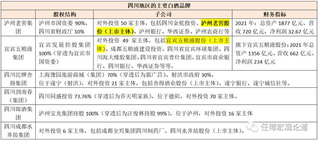 从股权结构及市场体量来看,位于泸州的泸州老窖和位于宜宾地区的五粮液是四川地区的白酒主品牌,在四川白酒行业中占有重要地位。而深化牌舍得集团、四川剑南春集团、郎酒集团、水井坊集团的政府痕迹会比较少,体量也更小。