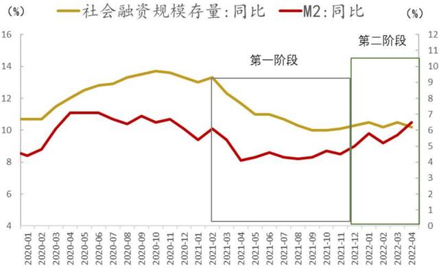 图1:2021年一季度至今,社融增速持续下行。M2增速在下行之后,2022年初拐头向上