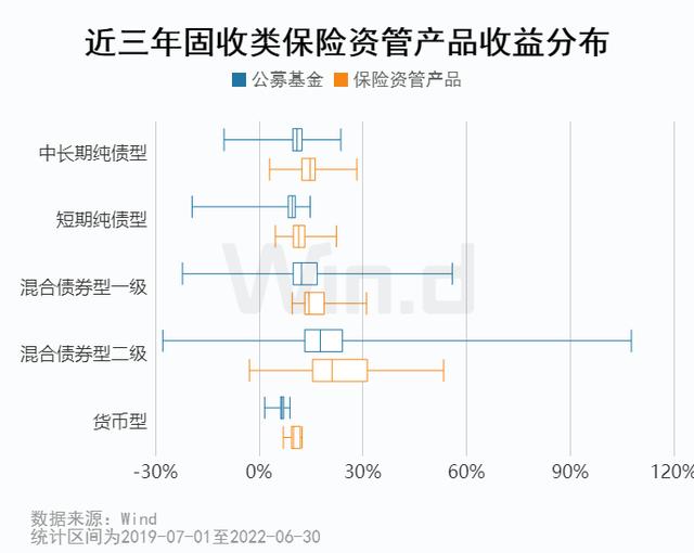 过去三年,混合型债券二级类保险资管产品收益中位数21.13%,领先固收其他类型产品。中长期纯债型保险资管产品三年收益中位数为14.72%,同期公募中长期纯债型基金回报中位数为10.96%;短期纯债型保险资管产品三年收益中位数为11.48%,同期公募短债基金收益中位数为9.63%。